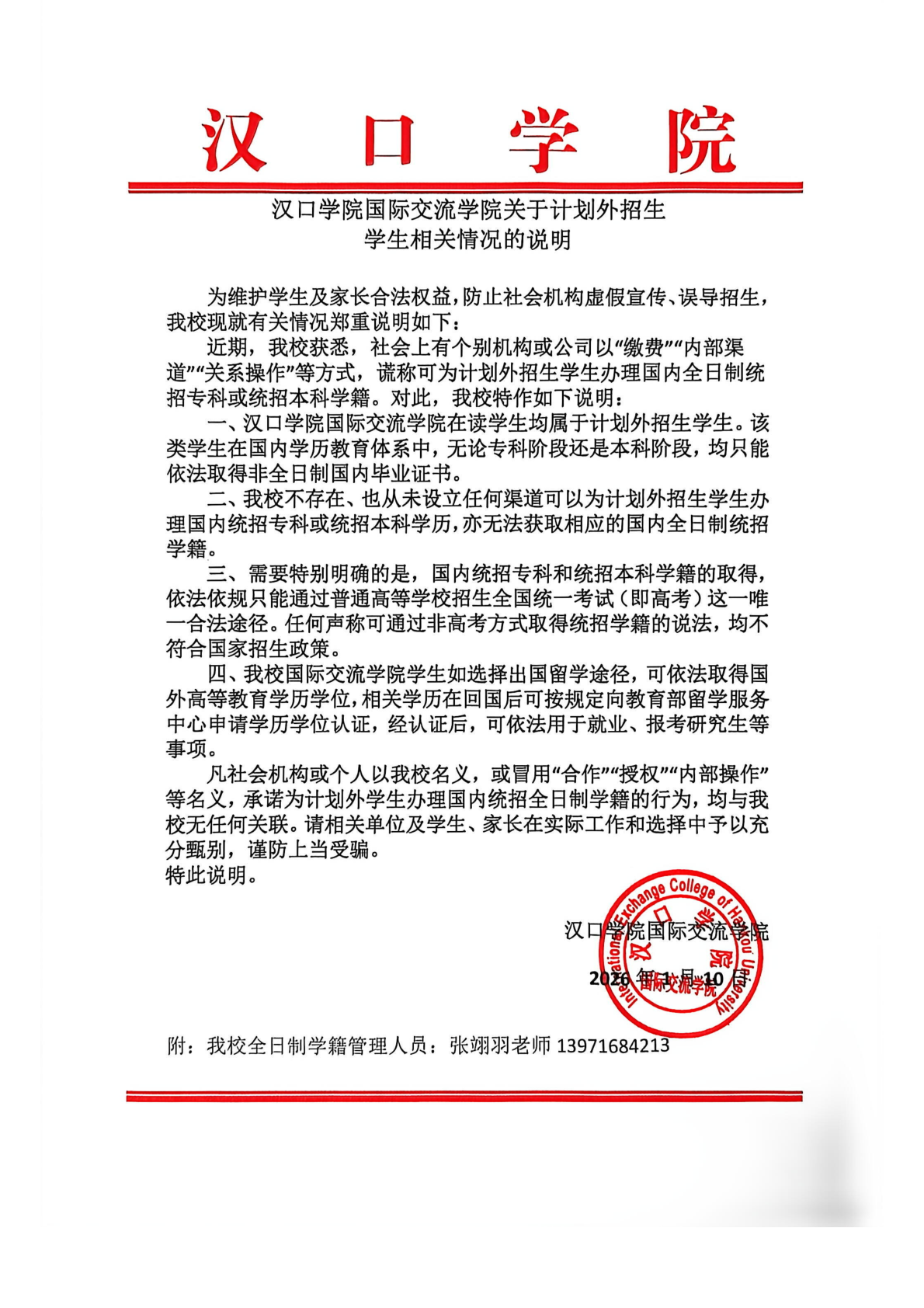 汉口学院国际交流学院关于计划外招生学生相关情况的说明